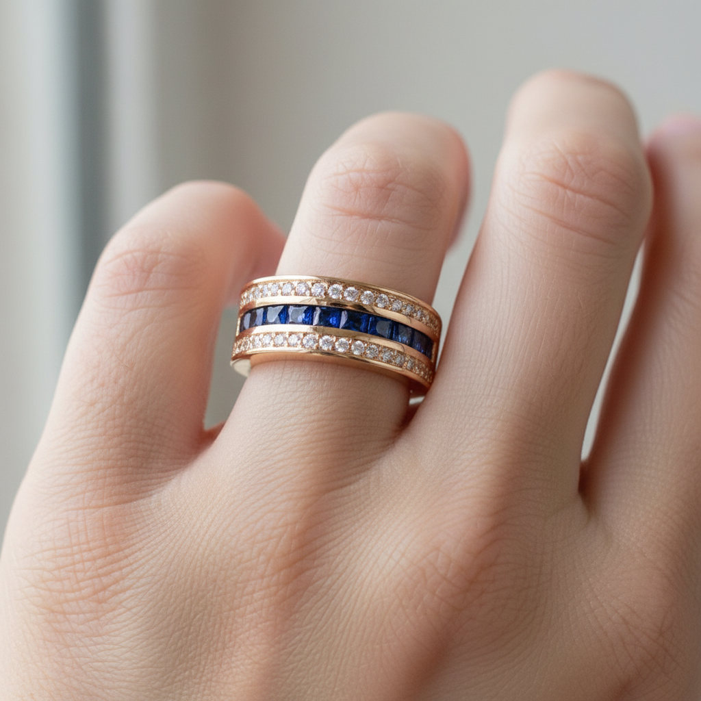 Ronan – Bague Homme Carrée Cristaux & Saphir Doré